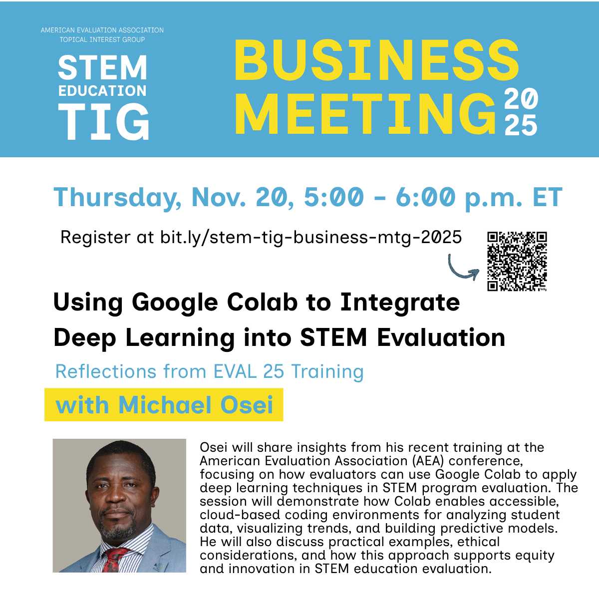 The STEM Education and Training Topical Interest Group (STEM TIG) represents professional program evaluators who work within the fields of science, technology, engineering and math (STEM) to improve the design, implementation, impact, and use of evaluation and research on STEM training, education and workforce development programs, policies, and partnerships. We focus on the application of evaluation to STEM programming as well the exploration of the art and science of evaluation within the context of STEM. Through our efforts we hope to both improve the practice and status of STEM evaluation, and enhance our clients’ use of evaluation approaches and findings.