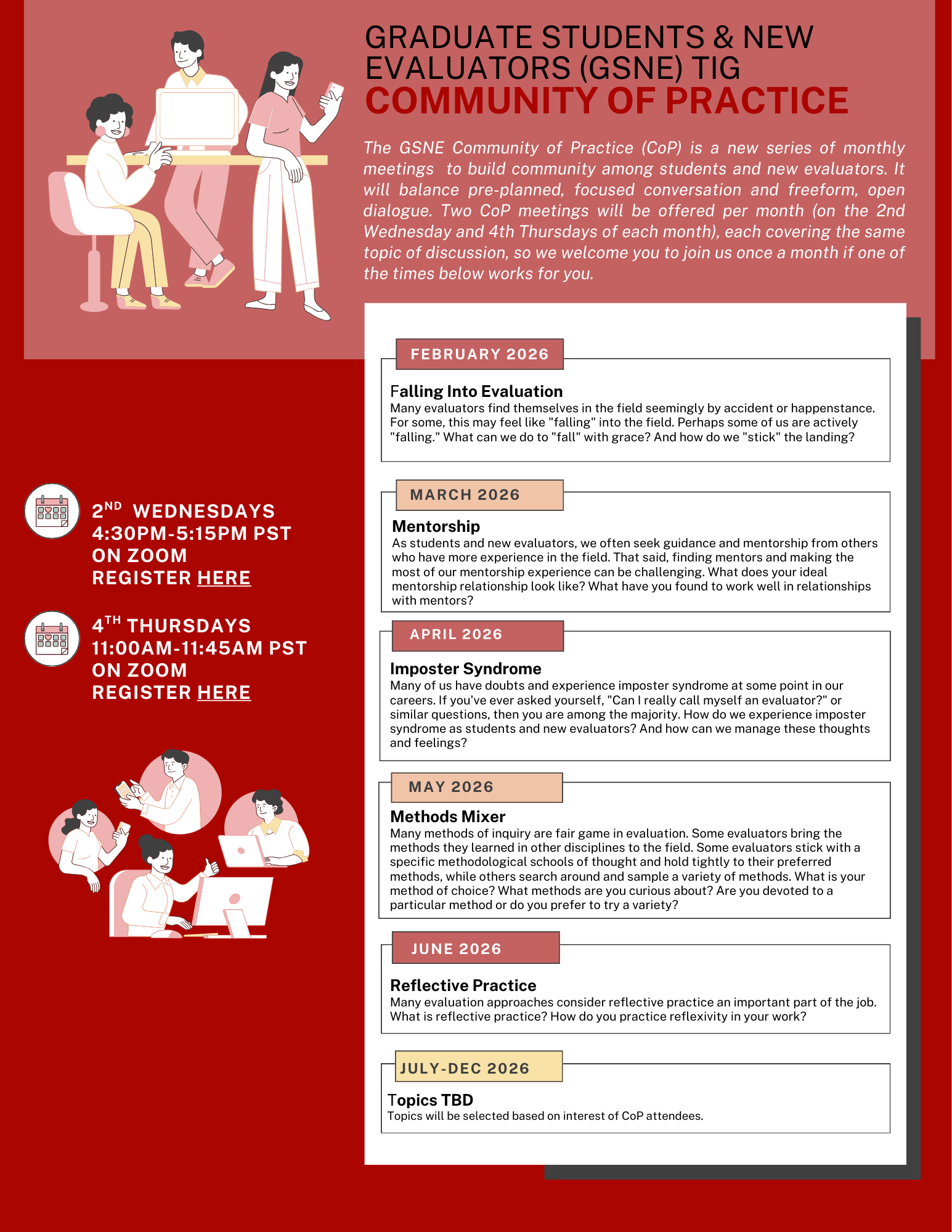 The GSNE Community of Practice (CoP) is a new series of monthly meetings hosted by TIG leadership for the purpose of building community among students and new evaluators from all backgrounds. It will balance preplanned, focused conversation and freeform, open dialogue. We expect to host two CoP meetings per month (on the 2nd Wednesday and 4th Thursdays of each month), but each meeting will cover the same topic of discussion, so we welcome you to join us once a month if one of the times below works for you.