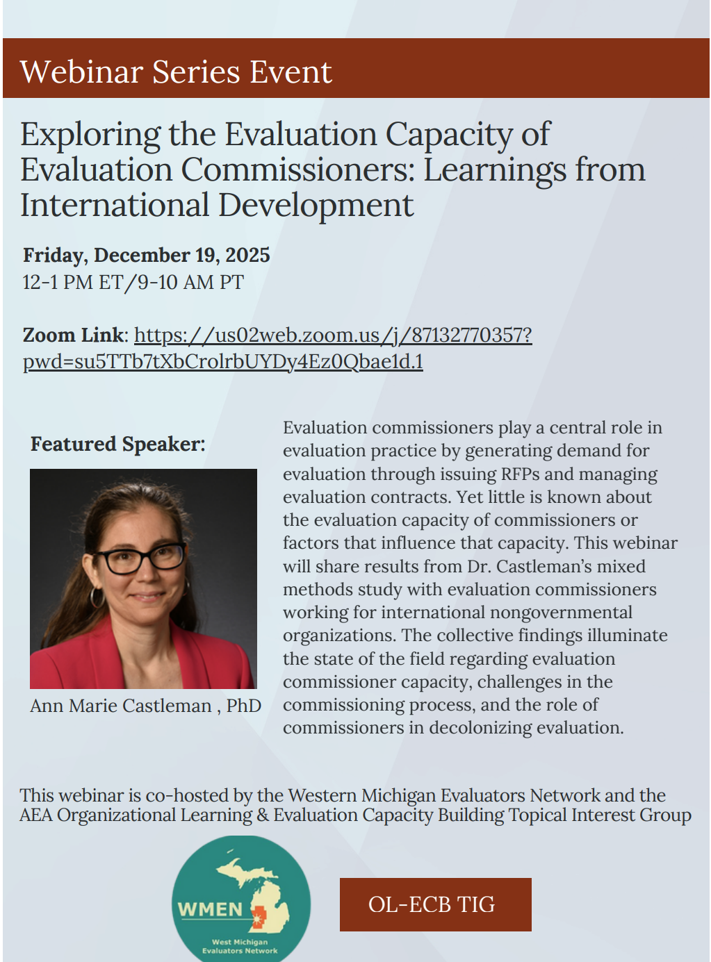 OL-ECB TIG members include professional evaluators who are responsible for building the capacity of non-evaluators to understand and apply evaluation principles and skills and/or facilitate learning from evaluation findings at the organizational level.