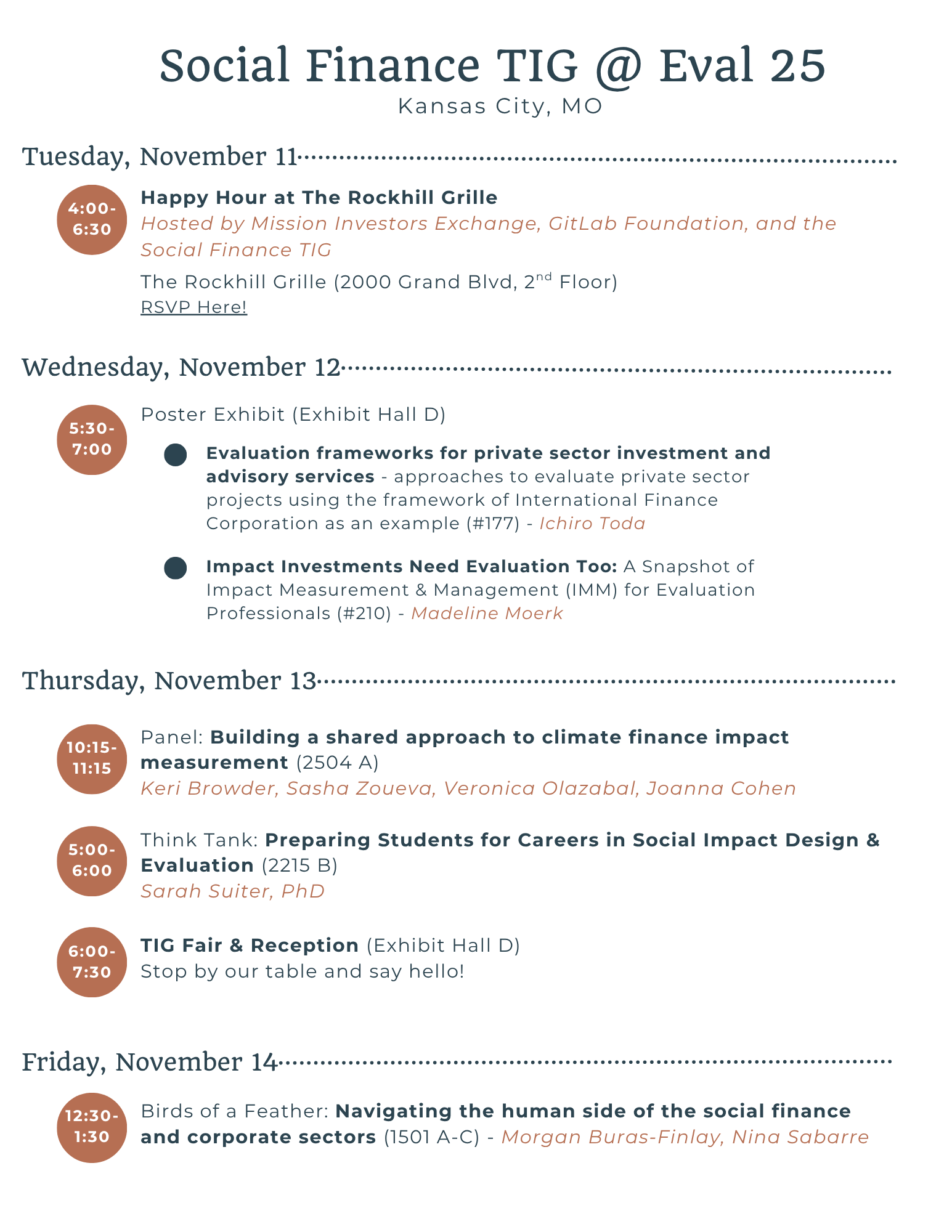 Will we see you in Kansas City? The Social Finance TIG is sponsoring the following events at Eval 25 in Kansas City, MO in November 2025: